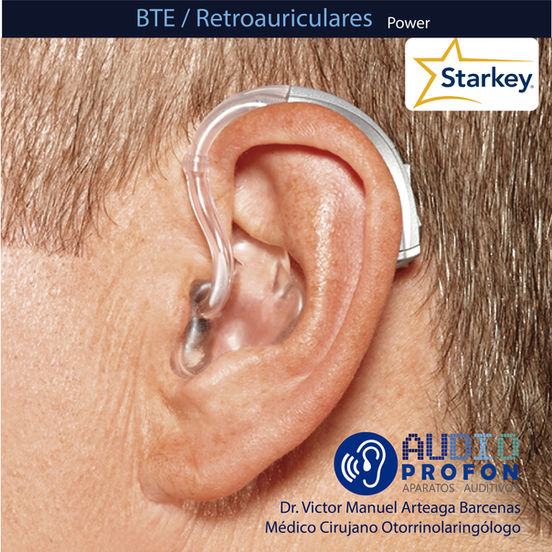 Como lo indican sus siglas en inglés BTE (Behind The Ear), estos auxiliares se colocan detrás de la oreja y son conocidos como retroauriculares. Se conectan al oído mediante un molde hecho a la medida del pabellón y conducto del paciente, y este molde sirve para fijar el auxiliar al oído y dirigir el sonido procesado hasta el tímpano, además deberá de ofrecer un buen sellado para pérdidas severas y profundas. Estos audífonos son muy versátiles, ya que compensan hipoacusias desde ligeras hasta profundas y restos auditivos, además de ser los más indicados para pacientes pediátricos. Su uso requiere poca destreza manual. Pueden utilizarse cómodamente incluso con armazones de lentes.